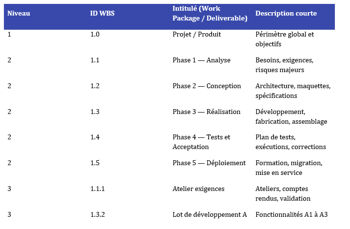 - Vue outline du WBS (4 colonnes : Niveau, ID WBS, Intitulé, Description courte)